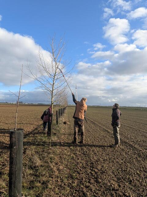 L’ensemble des peupliers du site a fait l’objet d’une taille de formation et d’un élagage complet. De nombreuses fourches avaient été observées, dues en grande partie à la pose de perchoirs à rapaces. Cette intervention devait impérativement être réalisée durant l’hiver, afin de ne pas être trop tardive pour la future exploitation du bois. Elle constitue une étape clé pour garantir la qualité et la durabilité de la plantation.